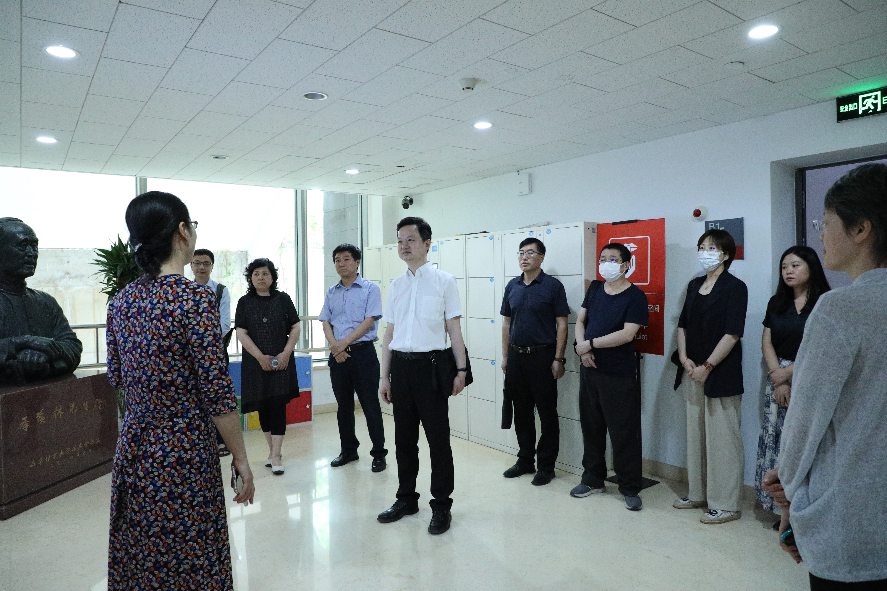 签约仪式前,华侨历史博物馆副馆长宁一、贾德成一行来到6165cc金沙总站检测中心图书馆6165cc金沙总站检测中心分馆参观,院党委书记李淑静、副院长吴杰伟陪同,图书分馆馆长张晓雁向华侨历史博物馆的领导和专家们介绍了外国语言文学学科的图书资料建设情况。