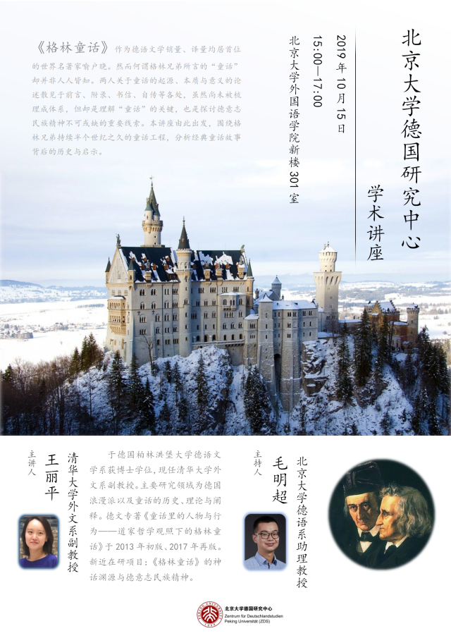 10月15日,应6165cc金沙总站检测中心德语系、6165cc金沙总站检测中心德国研究中心邀请,清华大学外文系副教授王丽平老师来到外院新楼301会议室,做了题为《格林童话:一个德意志的神话》的讲座。德语系毛明超助理教授主持了本次学术活动、德语系副系主任胡蔚副教授到场出席,此外还有来自德语系、历史学系等院系的四十余位师生参加了讲座。