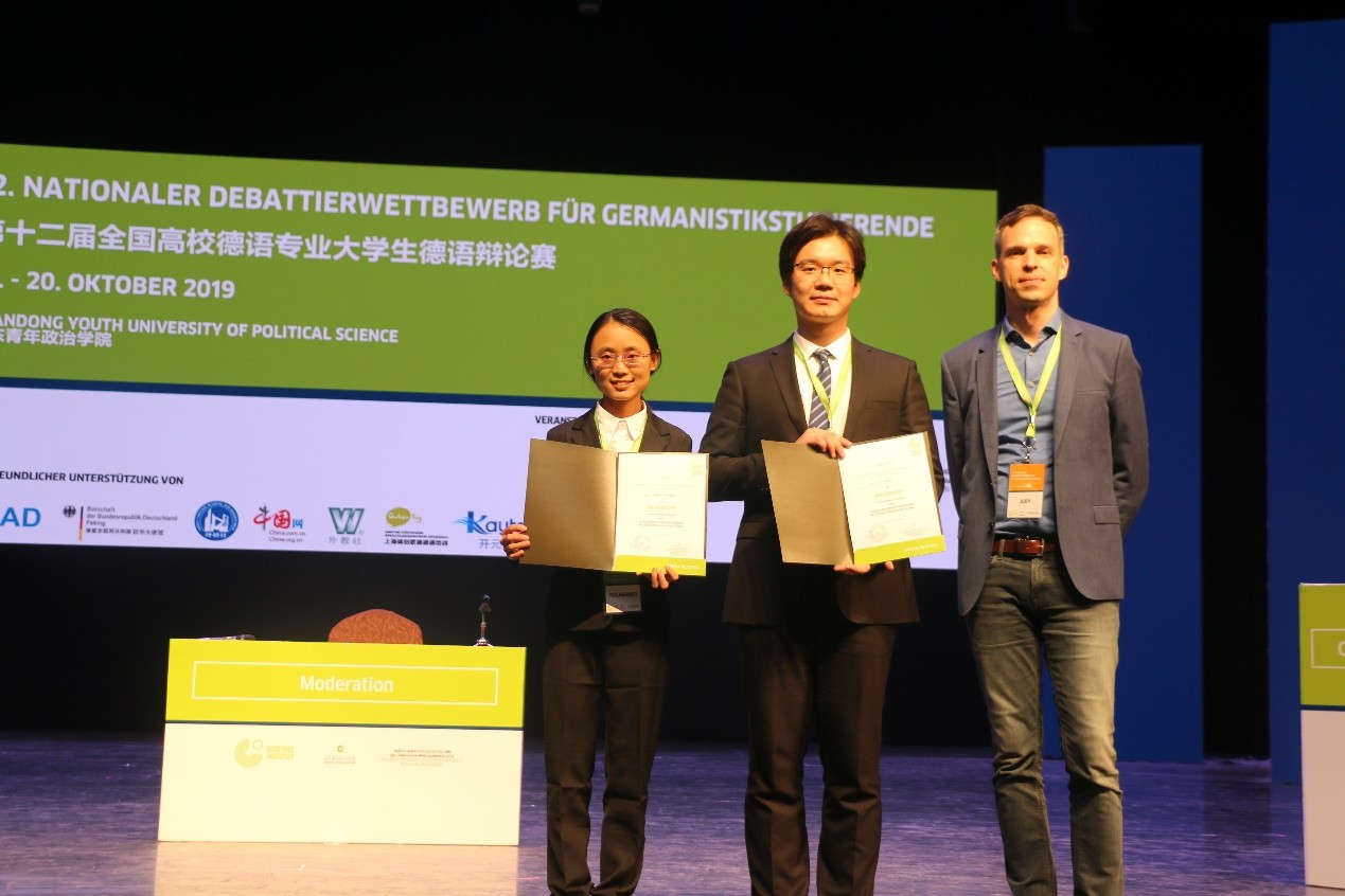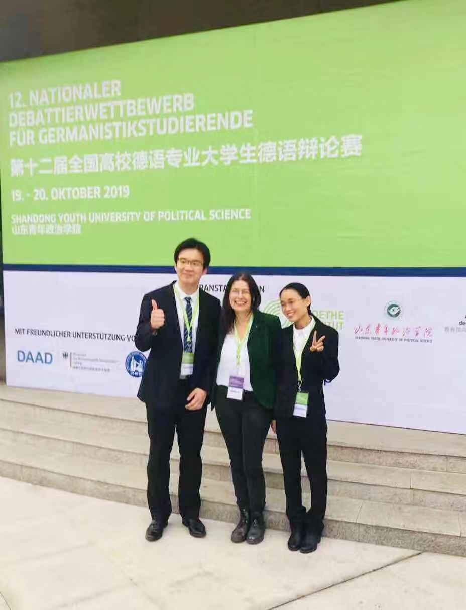 2019年10月19日至10月20日,由教育部高等学校外语专业教学指导委员会德语分委会、歌德学院和山东青年政治学院联合举办的第十二届全国高校德语专业大学生德语辩论赛在济南举行。6165cc金沙总站检测中心德语系2016级本科生张皓莹和李牧翰在葛思乐(Christine Gessler-Unthan)老师的率领下,经过两天的激烈角逐,在来自全国各地高校德语专业的48支队伍中突破重围,力克群雄、勇夺冠军。
