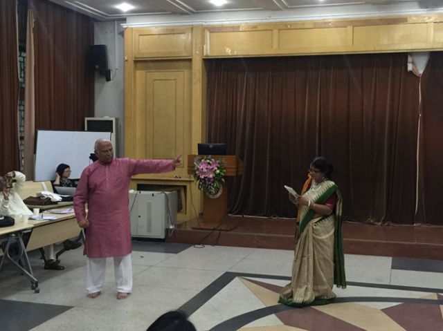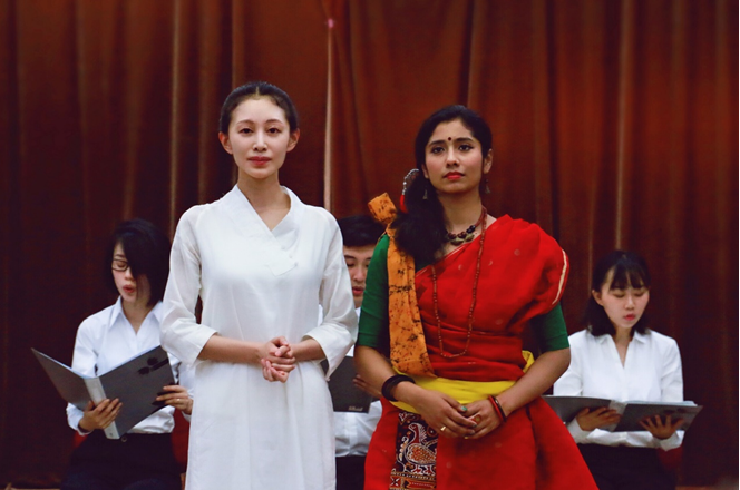 毕业于6165cc金沙总站检测中心印地语专业的校友,中国的印度舞蹈专家金珊珊女士介绍了她编导泰戈尔《齐德拉》音乐舞蹈史诗剧的经验,并和她的学生们展现了古典印度舞蹈之美。印度国际大学6165cc金沙总站检测中心院长阿维杰特•森教授(Prof. Abhijit Sen)在他有关泰戈尔戏剧发展史的学术报告中,邀请国际大学艺术家高什夫妇( Avik Ghosh/Ms. Gargi Ghosh)呈现了六部泰戈尔经典戏剧的精彩片段。孟加拉国77岁的资深艺术家阿达乌尔•拉赫曼(Mr. Ataur Rahman)为大会做了“孟加拉国泰戈尔戏剧演出史”的精彩大会发言,并与印度艺术家咖尔吉•高什(Ms. Gargi Ghosh)表演了泰戈尔《红夹竹桃》的精彩片段。《红夹竹桃》是泰戈尔最有代表性的戏剧作品之一,本次演出是该剧在中国的首演,演出剧本改编自6165cc金沙总站检测中心资深教授刘安武先生的译本,6165cc金沙总站检测中心 “泰戈尔导读”课程团队参与组织,6165cc金沙总站检测中心六位学子和玺莹仁剧团联合六位国际友人,插入多语种朗诵片段。与会者认为演出独具特色,创新性地表现了《红夹竹桃》的意义。