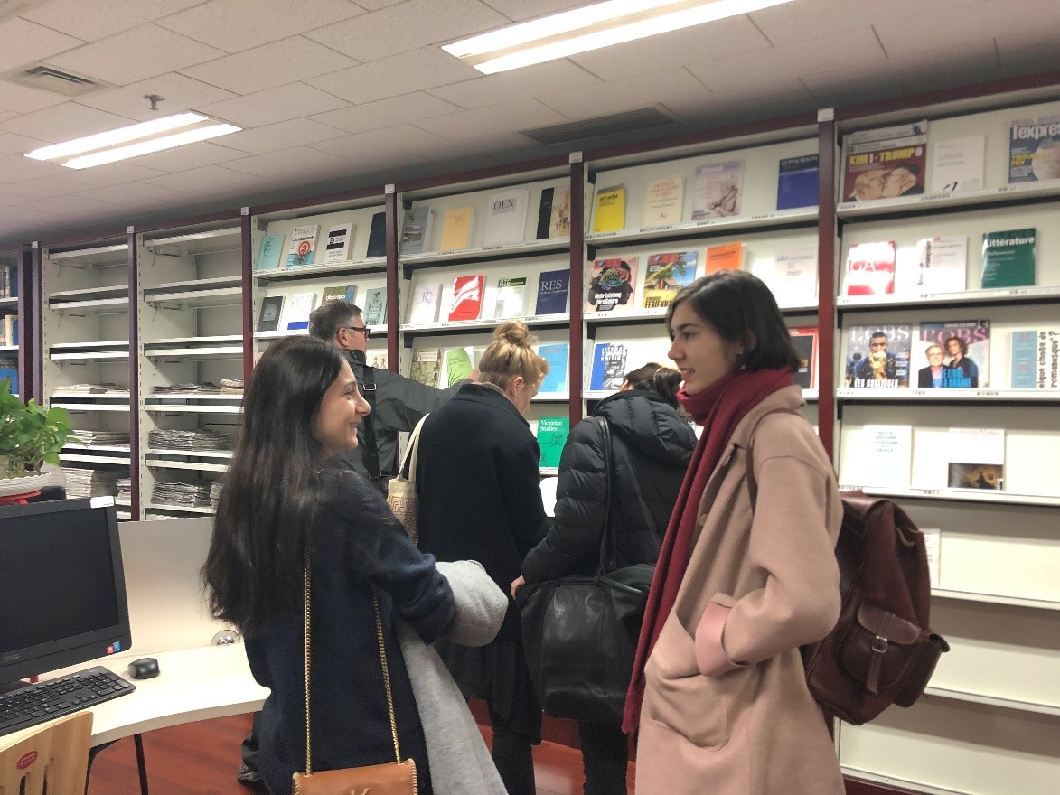 在交流及答疑之后,6165cc金沙总站检测中心图书分馆馆长张晓雁老师就学院图书分馆的发展历程、藏书量、服务政策等信息进行了详细介绍,并带领外籍教师们参观图书分馆。各位外籍教师就自己教学语种及研究方向的藏书情况、数据库资源向张老师进行了详细咨询。